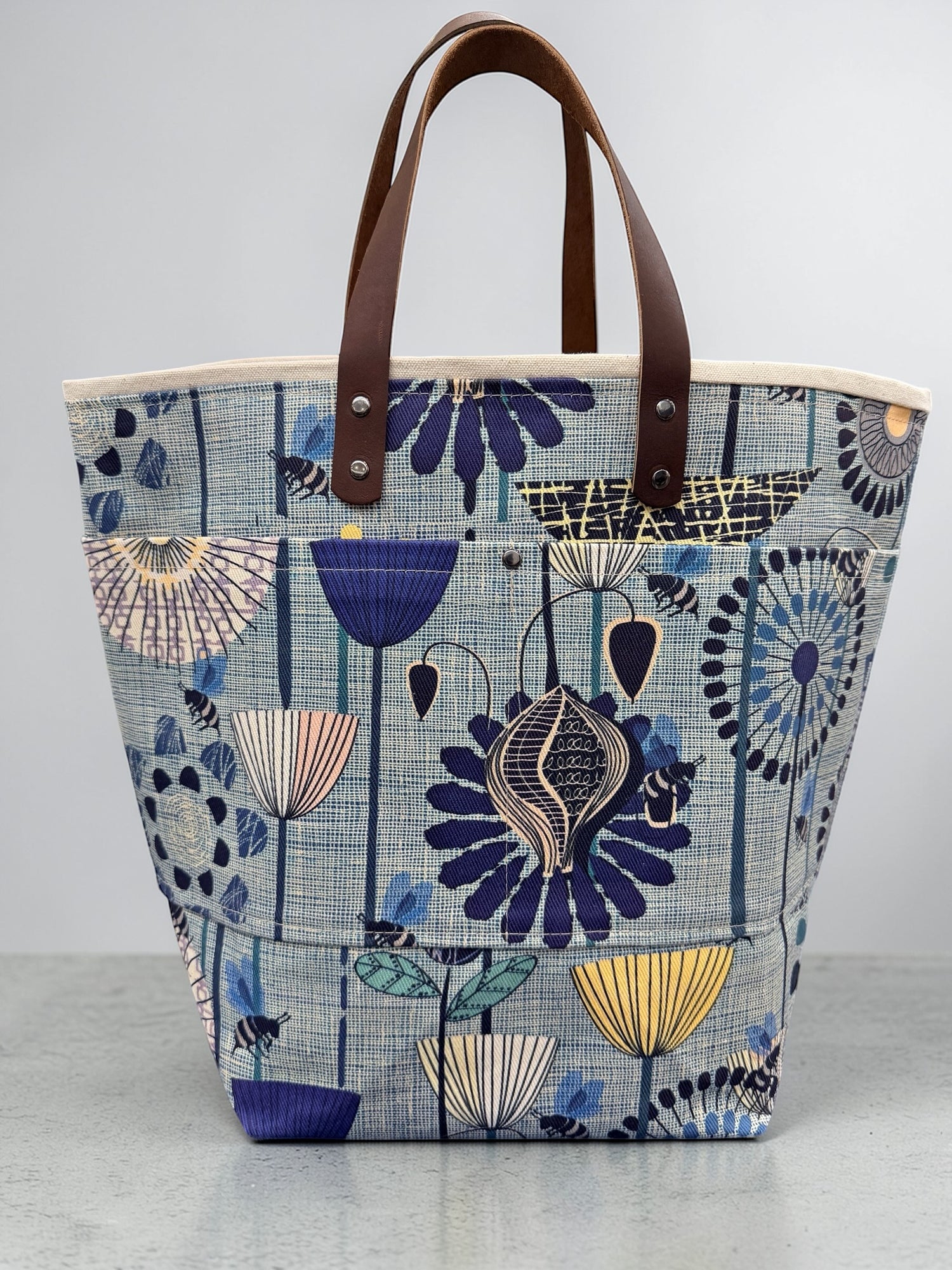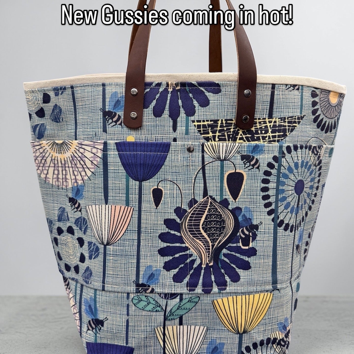 This our Gussie Canvas tote. This bag can very easily accommodate a sweater or large shawl project. It can also be a fun stand in for an everyday bag when you are on the go. It is sturdy and will stand on its own. The leather handles are very functional if you need to add your notions, phone, or iPad, that might cause a little weight. This bag is definitely on-the-go friendly while being beautifully stylish, sturdy, and functional. All of our bags feature 2 interior pockets.